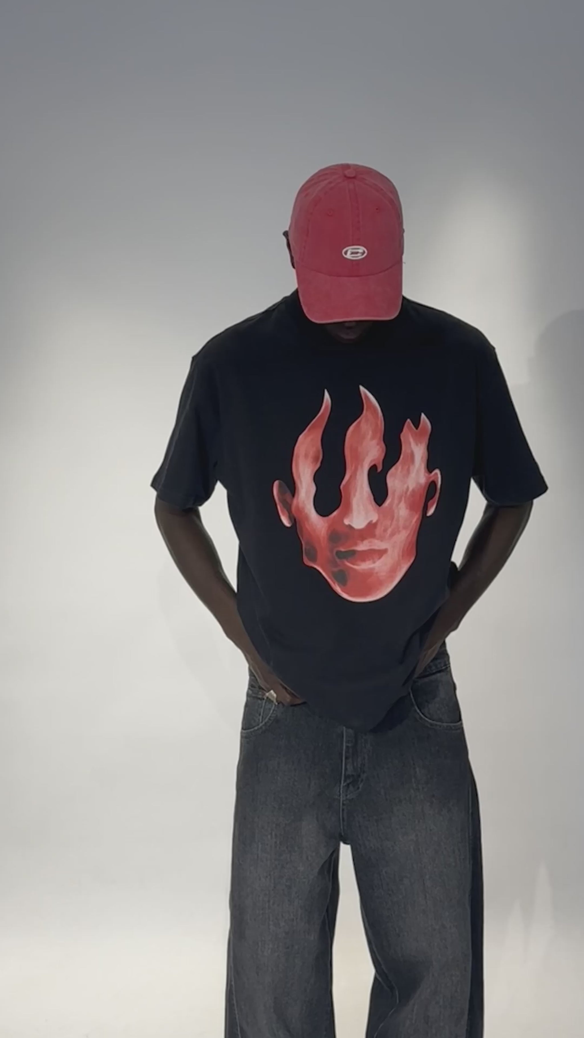 Akışkan formda kurgulanmış yüz deseni, keskin sınırlar yerine dağılma hissiyle daha özgür bir ifade oluşturur. Ton geçişleriyle derinlik kazanan baskı, tek bir yüzey üzerinde katmanlı bir etki yaratır.
