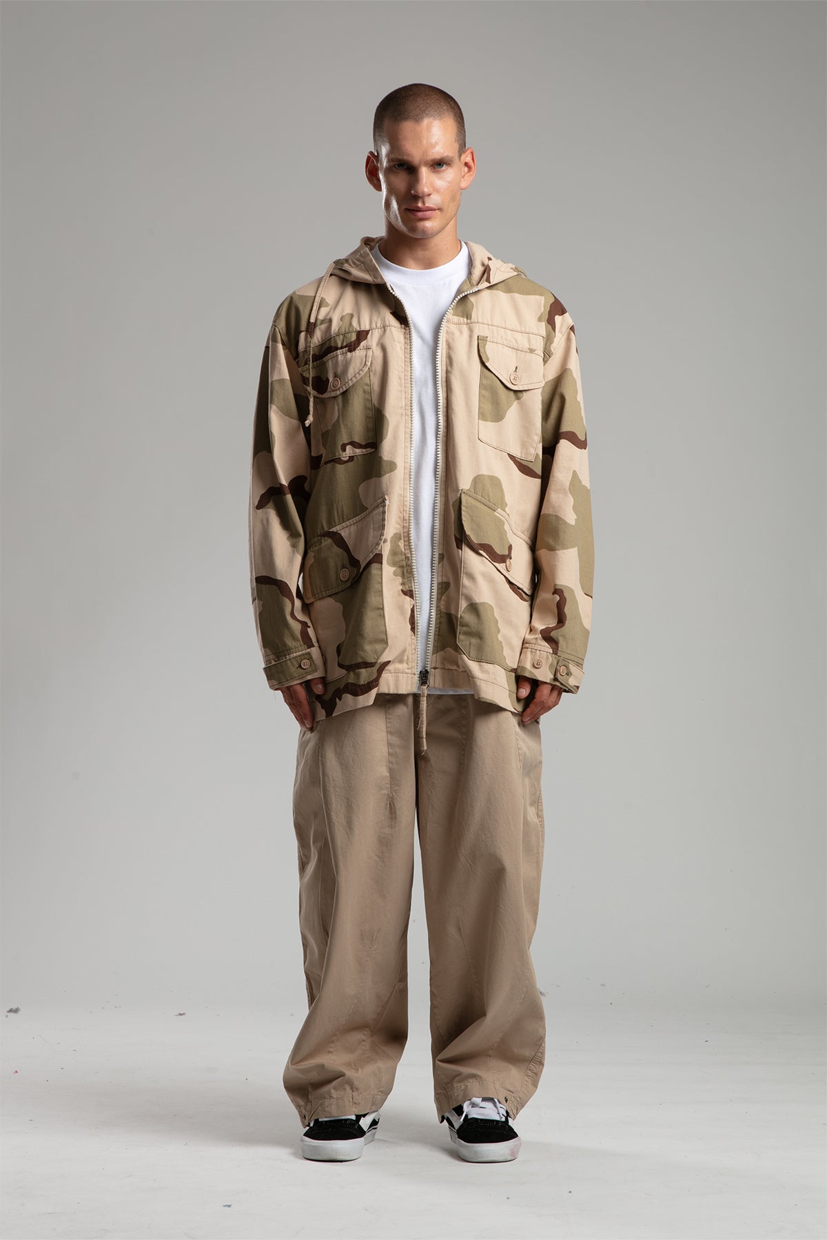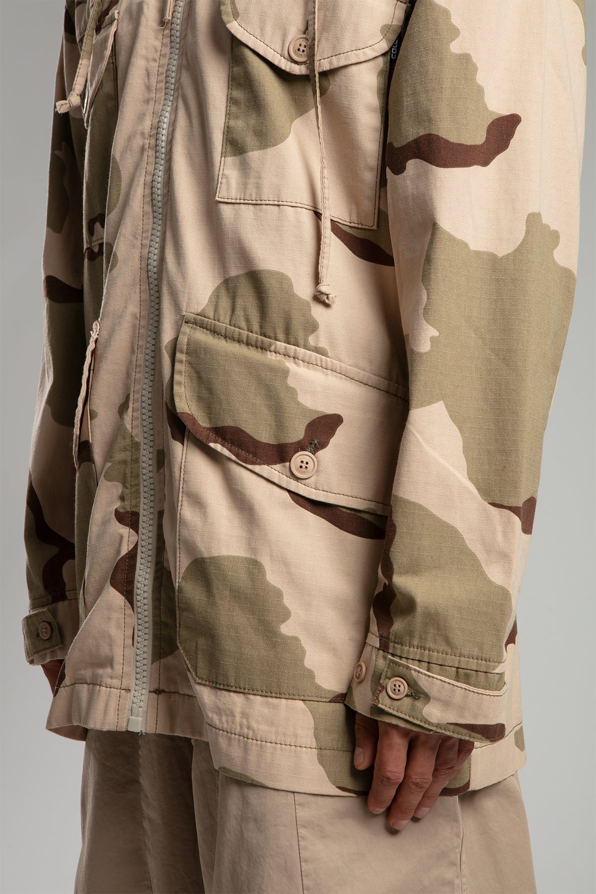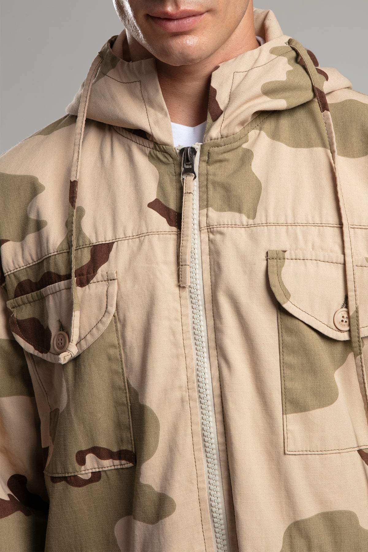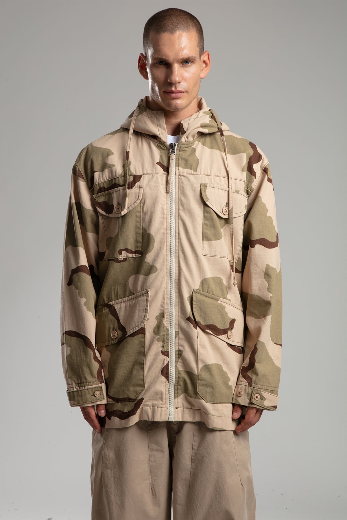 Kamuflaj Desenli Kapşonlu Uzun Ceket